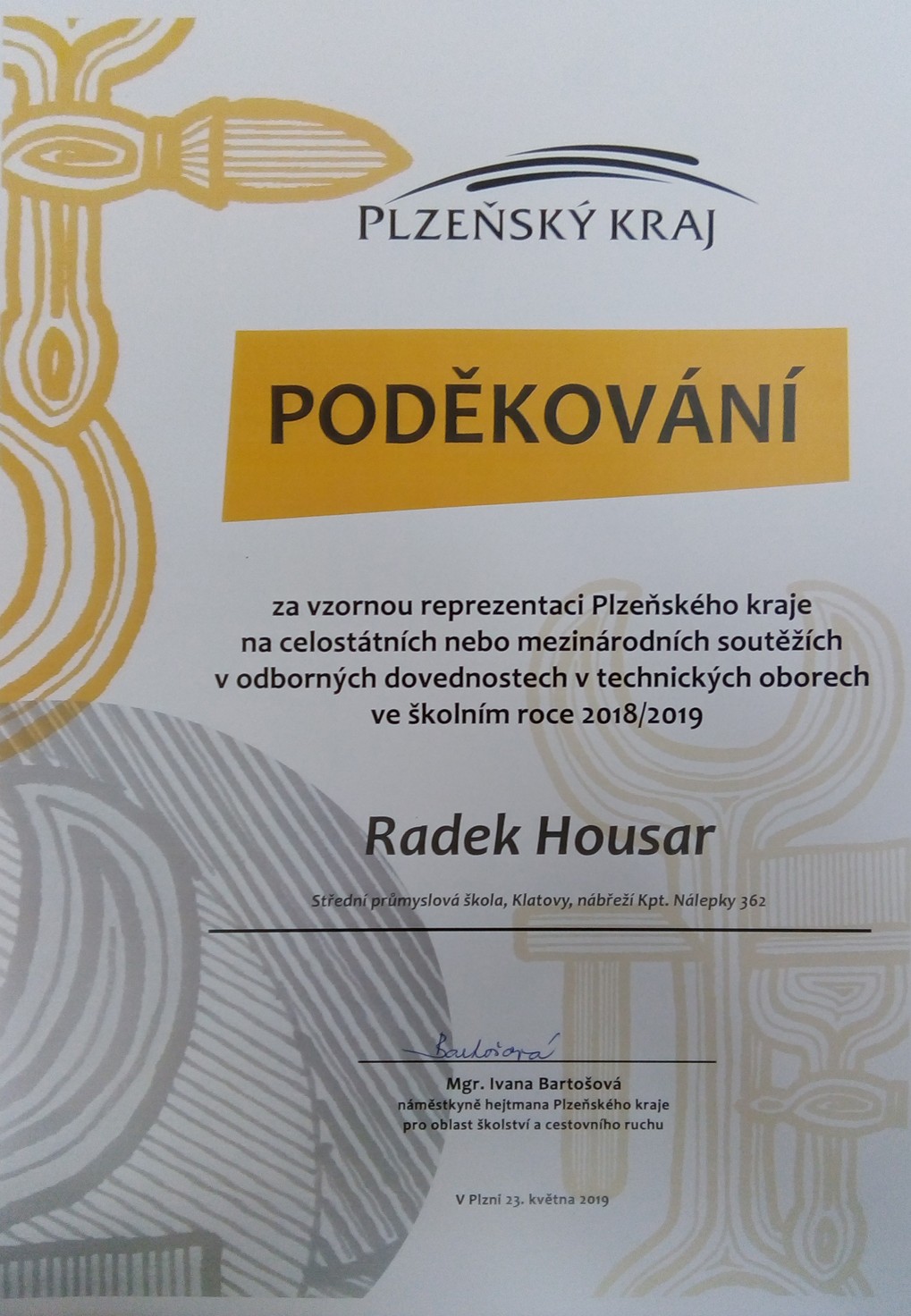 Žák čtvrtého ročníku SPŠ Klatovy Radek Housar byl oceněn na základě