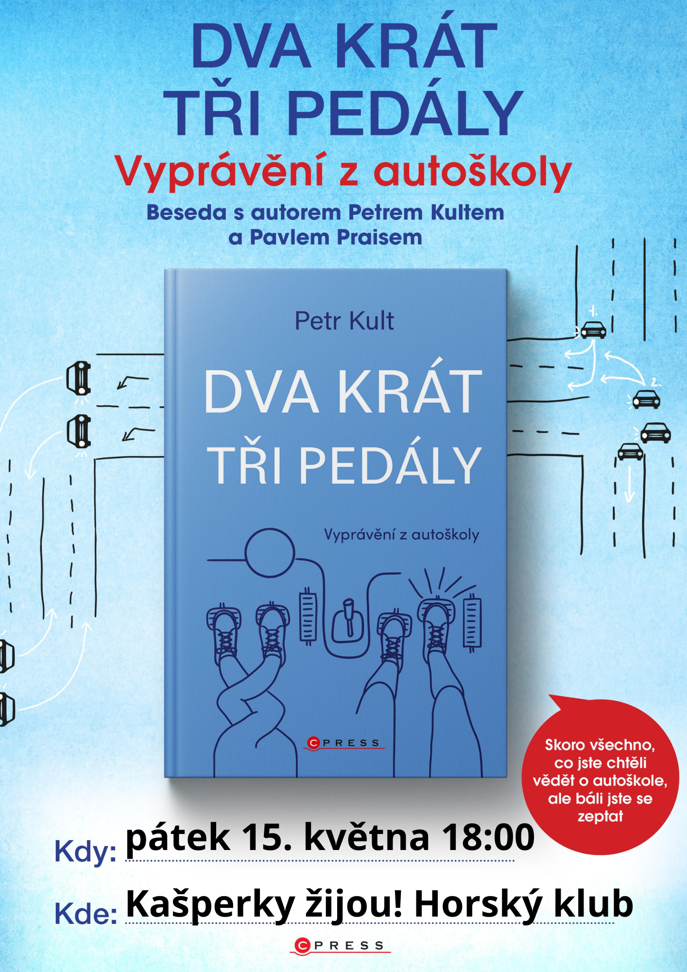 Skoro všechno, co jste chtěli vědět o autoškole, ale báli jste se zeptat. Kniha Petra Kulta Dvakrát tři pedály seznamuje čtenáře s aspekty práce učitele autoškoly. Autor pracuje se svými zážitky z vlastní učitelské kariéry, které doplňuje rozhovory s kolegy a dalšími odborníky, s cílem pobavit čtenáře, ale také ho jako případného řidiče obohatit formou osvěty. Jsou učitelé autoškol chlípníci? Proč se učíme rozjezd do kopce bez ruční brzdy? Naučí nás vlastně autoškola řídit? Mnoho otázek, mnoho odpovědí.