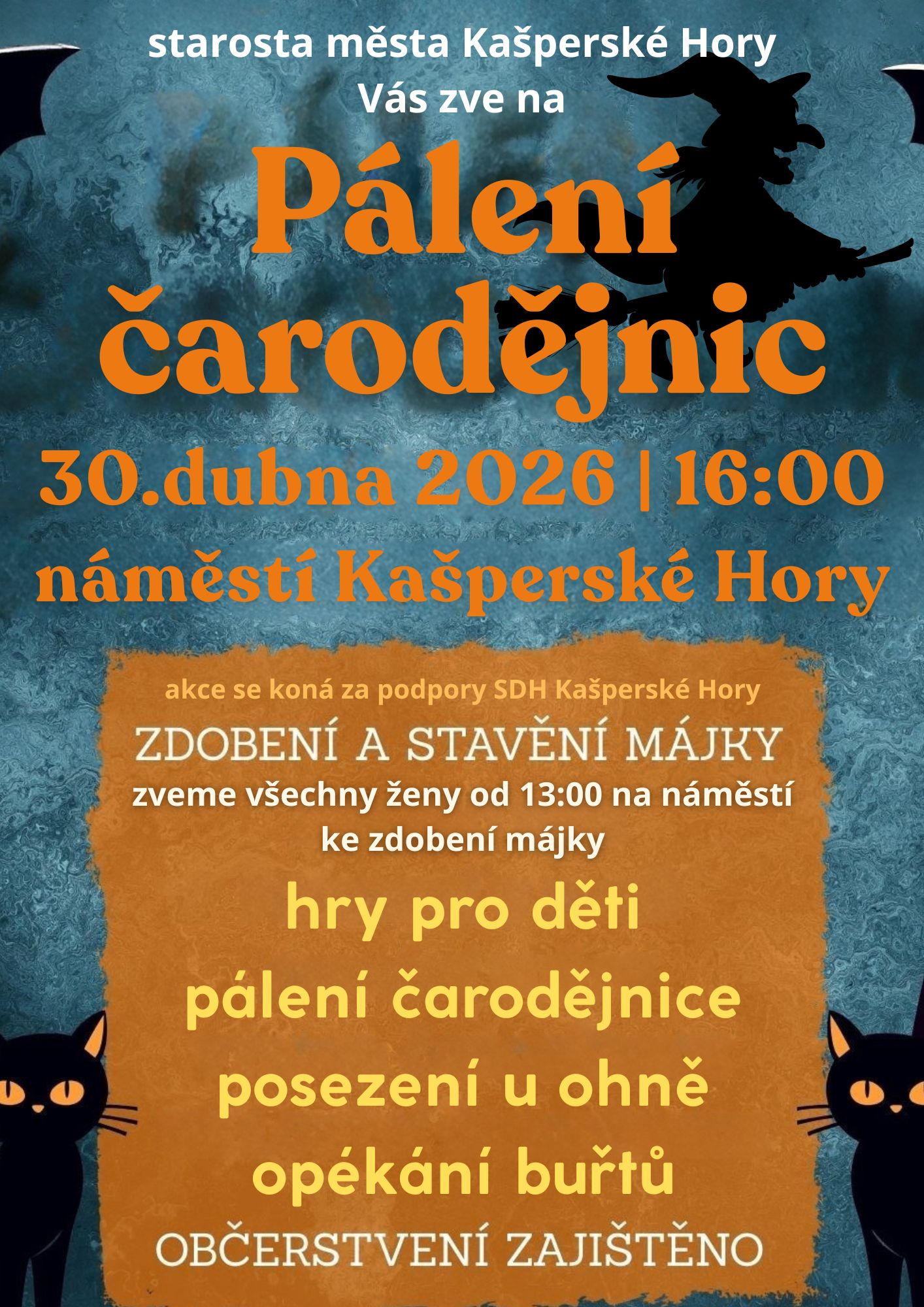 Hry pro děti, stavění májky, pálení čarodějnic, posezení u ohně, opékání buřtů, občerstvení zajištěno.