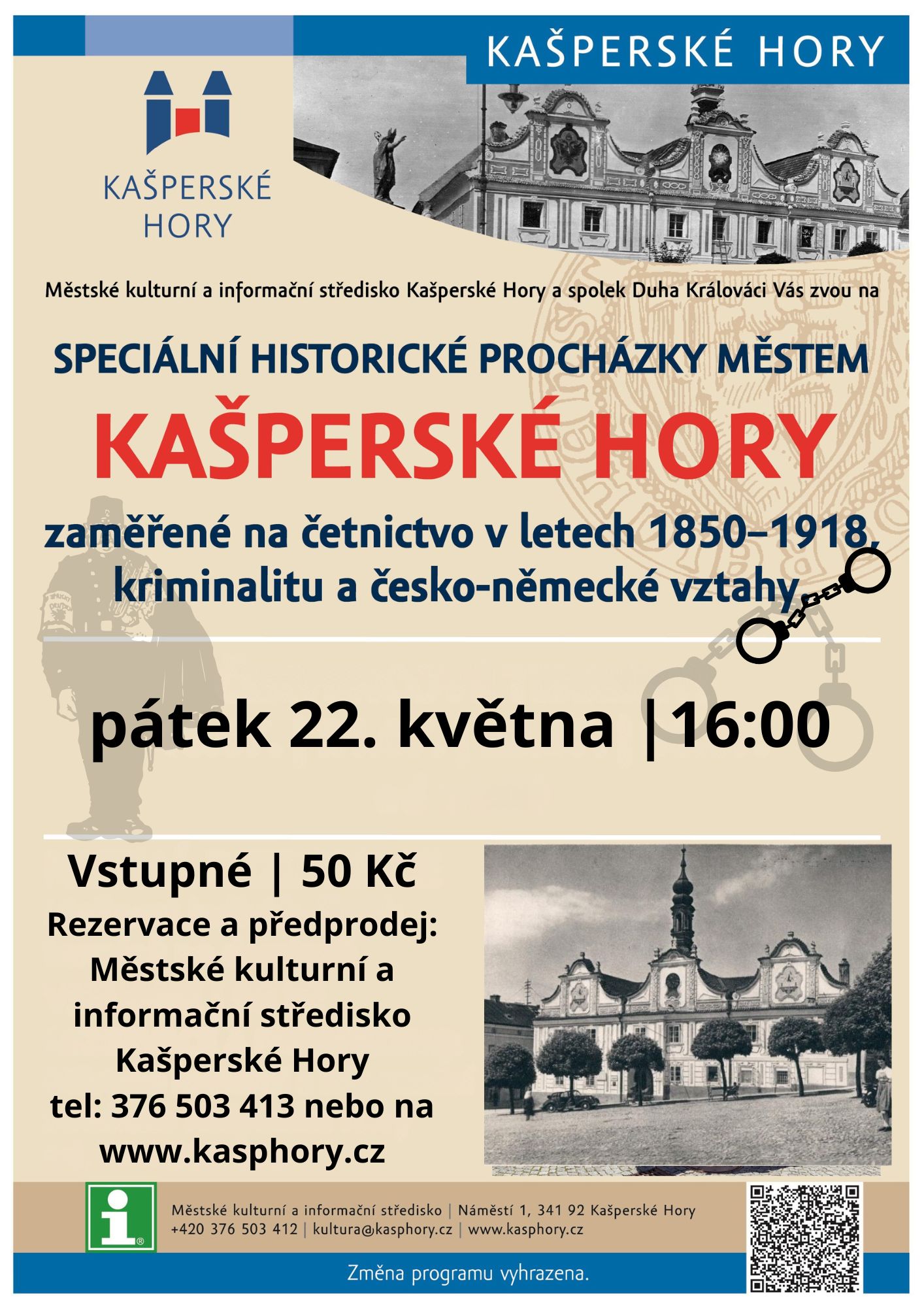 Městské kulturní a informační středisko a spolek Duha Králováci Vás zvou na speciální historické procházky městem Kašperské Hory zaměřené na četnictvo v letech 1850–1918, kriminalitu a česko-německé vztahy.