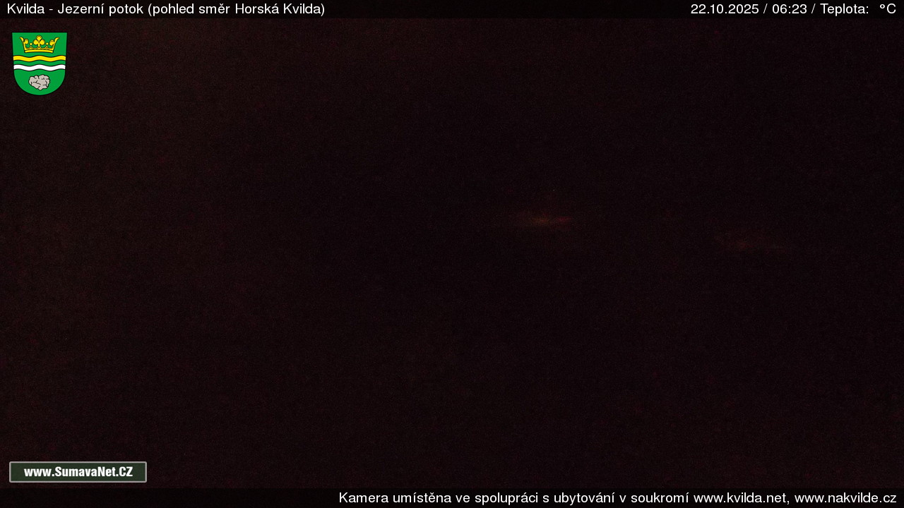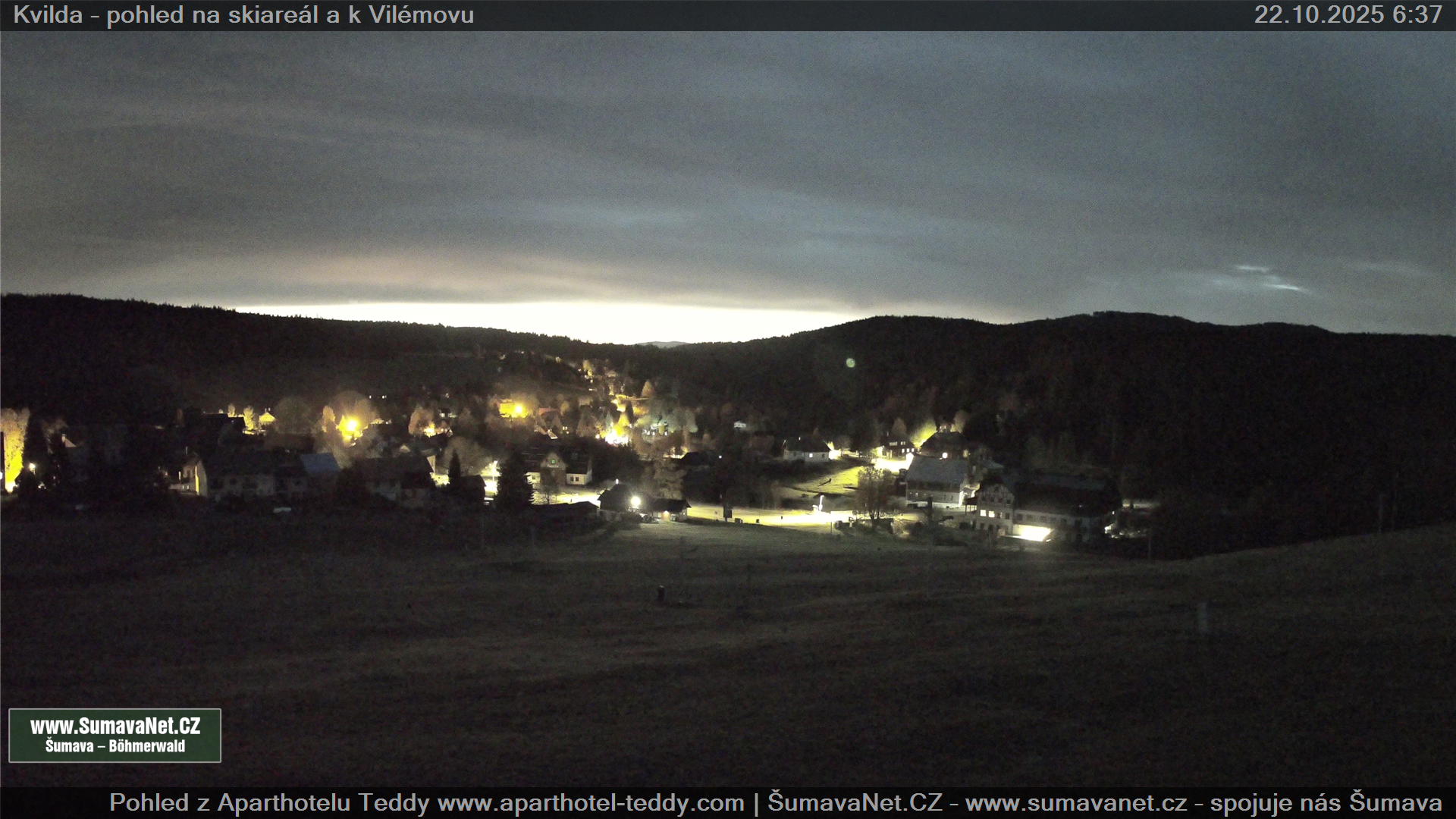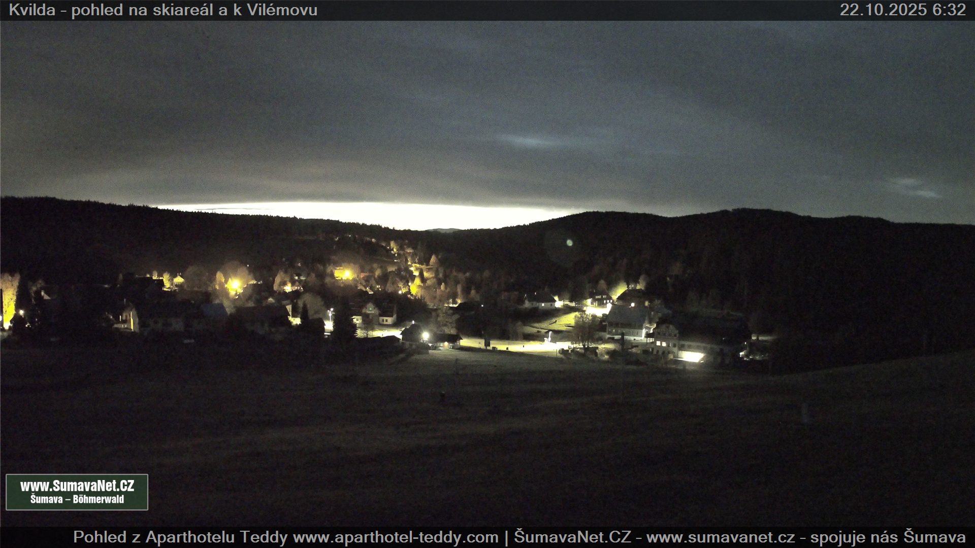 Page contentWebCamsKvildaBig Image21.10.2025 21:32:23Select time: Archive: Today 1 day 2 days Week Month 100 days Year Provozováno Informačním serverem ŠumavaNet.CZ ŠumavaNet.CZ & Aparthotelem TeddyKvilda - Jezerní potokBig Image21.10.2025 21:25:37Select time: Archive: Today 1 day 2 days Week Month 100 days Year Kvilda - centrum21.10.2025 21:32:23BučinaBig Image21.10.2025 21:28:07Select time: Archive: Today 1 day 2 days Week Month 100 days Year Další webkamery Tyto dvě kamery Vám přinášíme ve spolupráci se sumava.eu Refresh page