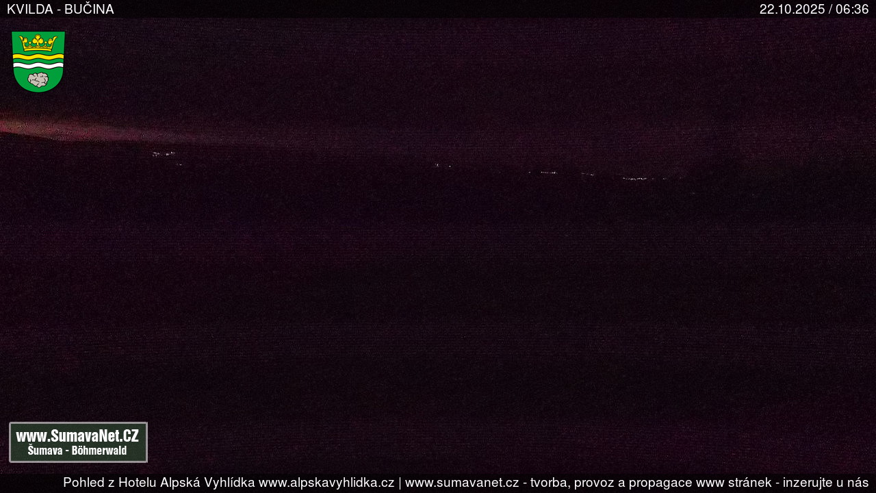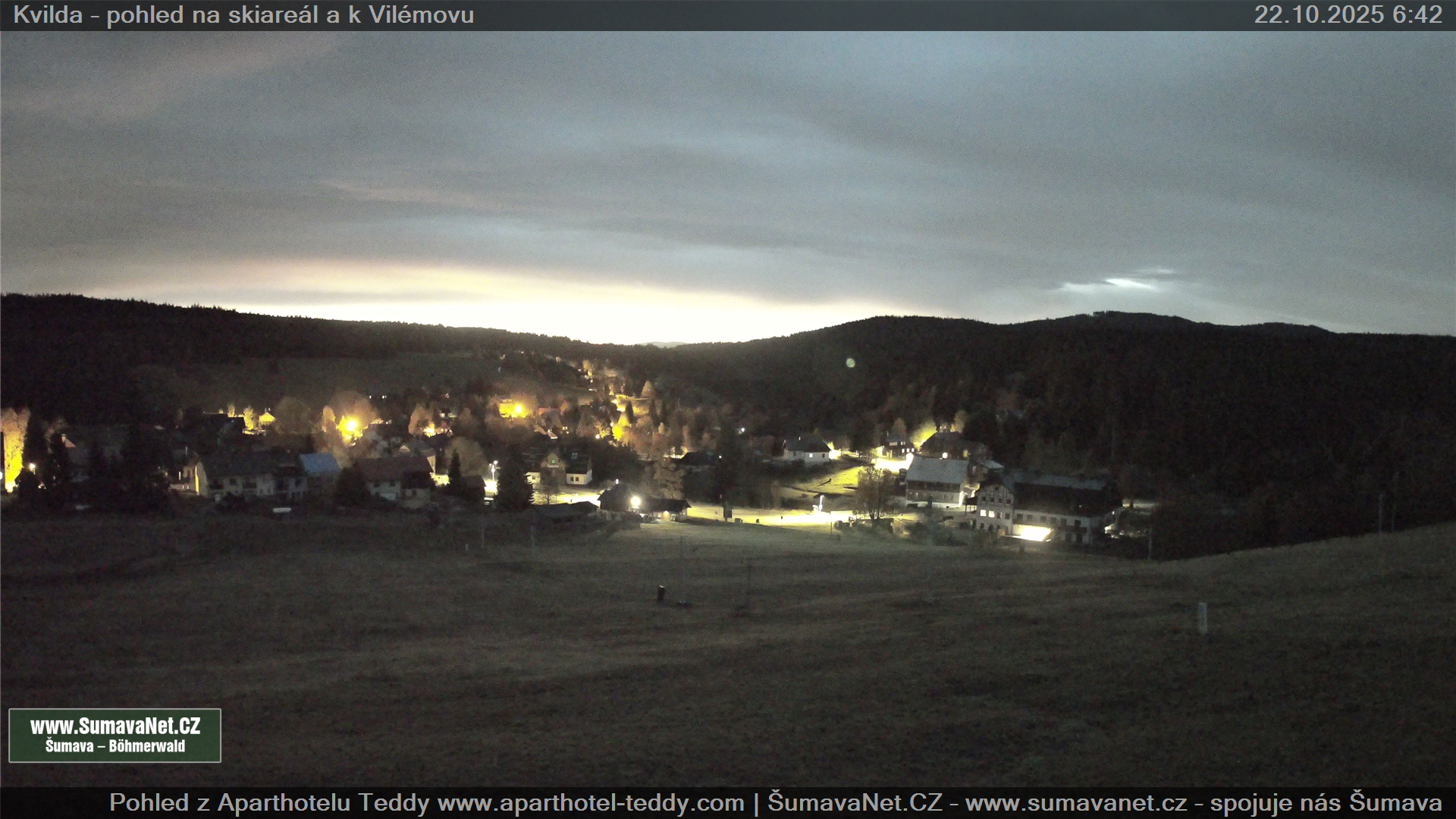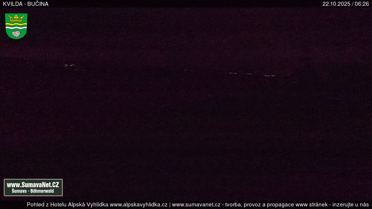 Page contentWebCamsKvildaBig Image21.10.2025 21:32:23Select time: Archive: Today 1 day 2 days Week Month 100 days Year Provozováno Informačním serverem ŠumavaNet.CZ ŠumavaNet.CZ & Aparthotelem TeddyKvilda - Jezerní potokBig Image21.10.2025 21:25:37Select time: Archive: Today 1 day 2 days Week Month 100 days Year Kvilda - centrum21.10.2025 21:32:23BučinaBig Image21.10.2025 21:28:07Select time: Archive: Today 1 day 2 days Week Month 100 days Year Další webkamery Tyto dvě kamery Vám přinášíme ve spolupráci se sumava.eu Refresh page