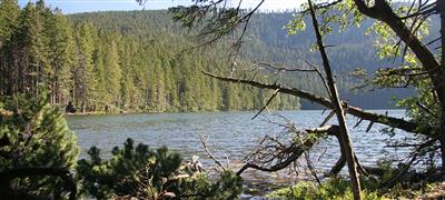 Kolem jezera vede okružní turistická stezka. Výhled na Velký Javor. Hostinec Seehäusl.