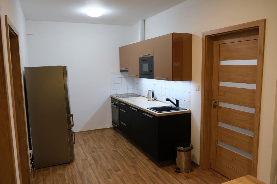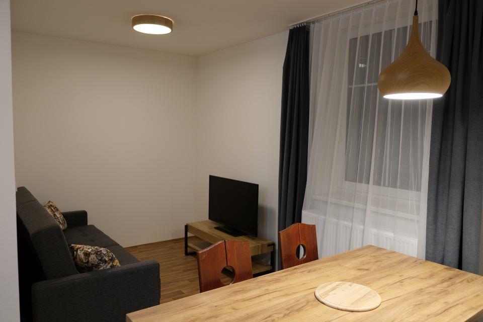 apartmány pro 4 – 6 osob s uspořádáním 3+KK, WC, sprcha, TV a Wi-Fi, komplet vybavená kuchyňka (lednice s mrazákem, myčka, trouba, mikrovlnka, nádobí, atd.)