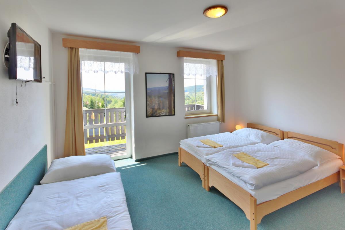 dvoulůžkové nebo třílůžkové pokoje, vybavené WC, sprchou , TV a Wi-Fi internetem.